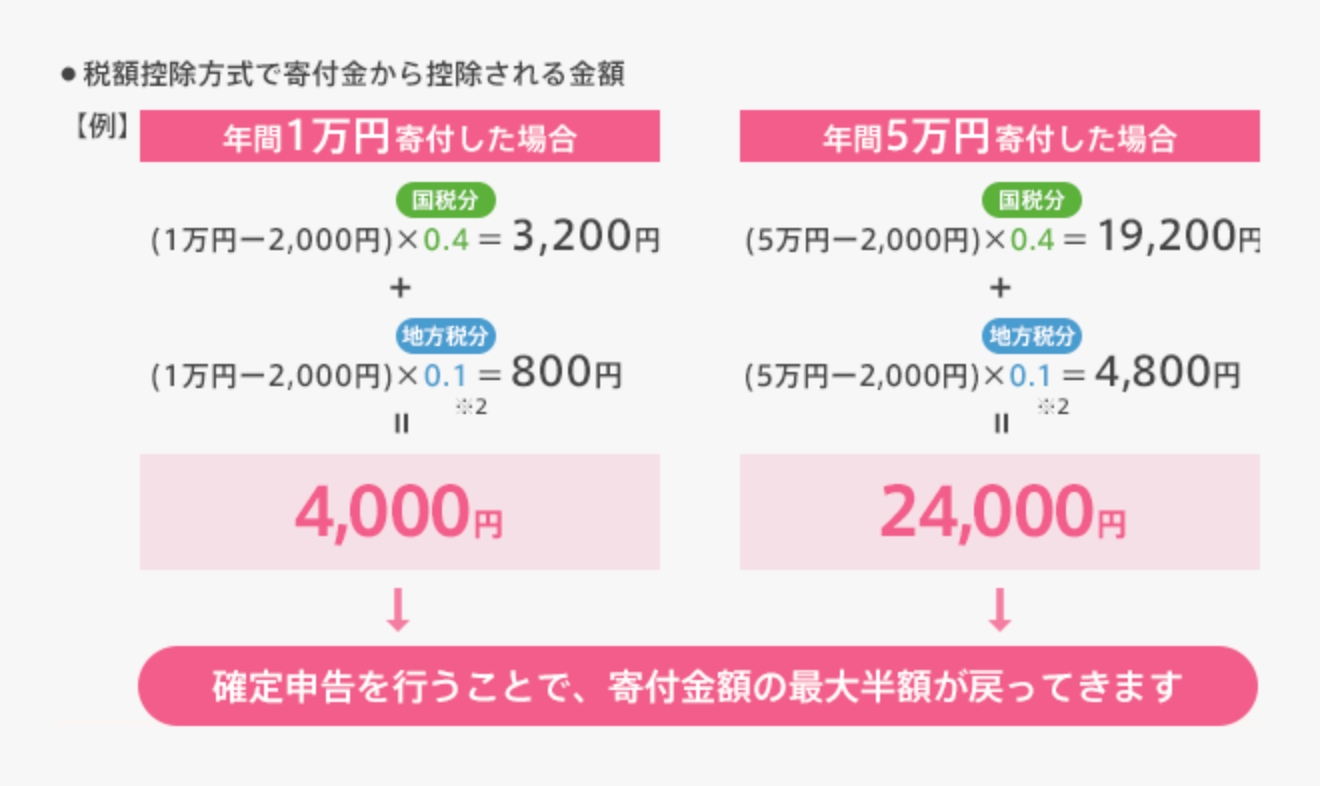 | 寄付金控除 | 寄付金から2,000円を引いた額の最大50%(所得40%+10%)※1 が戻ってきます。![]() ※1 住民税も寄付金控除の対象になり、控除割合は最大10%(都道府県民税4%/市町村住民税6%)です。ただし、各自治体によって異なります。 ※控除額には一定の上限額があります。また、所得によっては従来の所得控除方式が有利となる場合があります。詳しくは最寄の税務署にお問い合わせください。 ※法人の場合、一般寄付金の損金算入限度額とは別に、特別損金算入限度額の範囲内で、損金として算入することができます。詳しくは最寄の税務署にお問い合わせください。 |